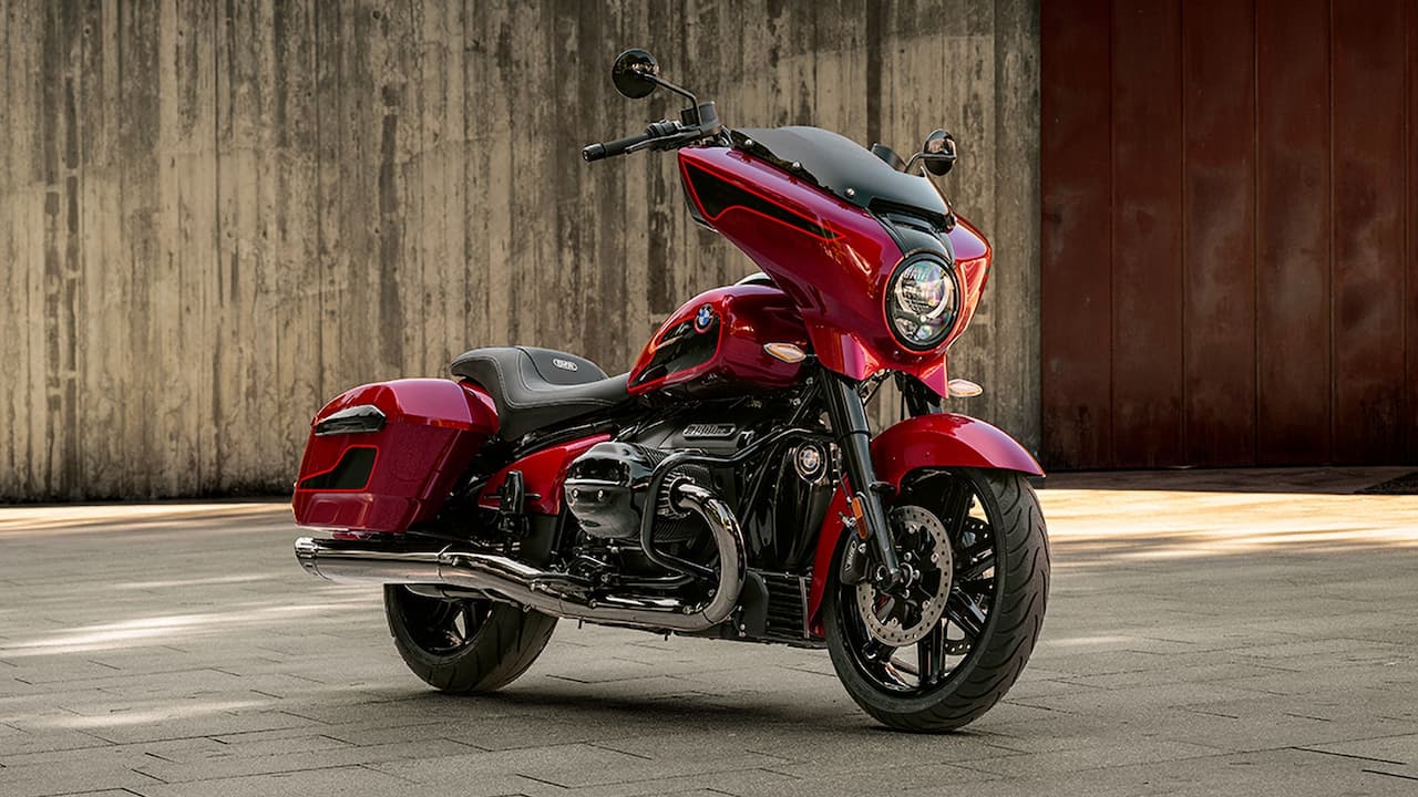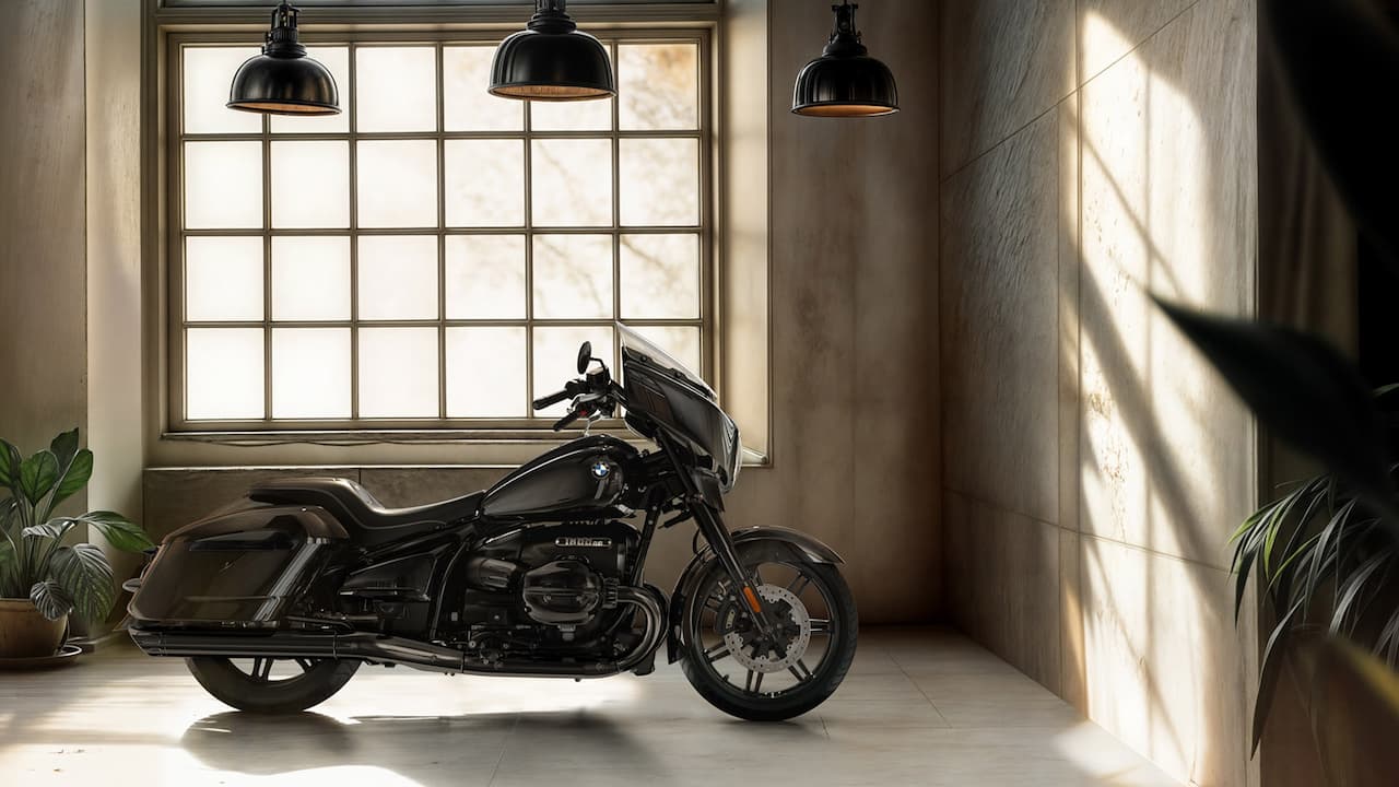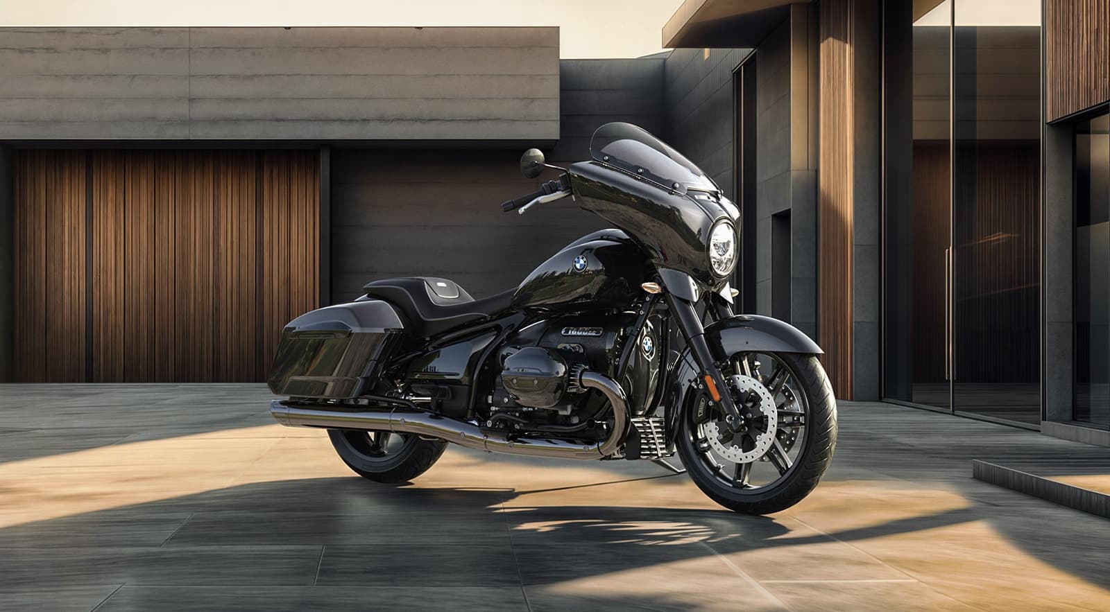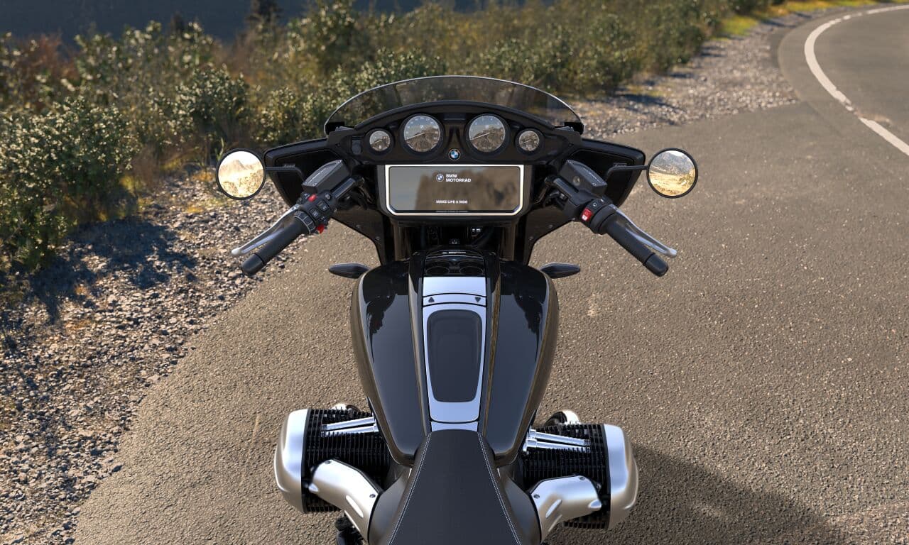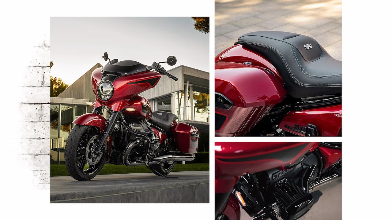La ligne typiquement descendante commence par un carénage avant haut caractéristique et se poursuit avec un réservoir de 24 litres en forme de goutte et une longue selle jusqu'à une partie arrière, avec des valises fixes intégrant des feux arrière. Typique d'une BMW Motorrad : un design à la fois sobre et marqué. Typique d'un bagger : la forme aérodynamique.